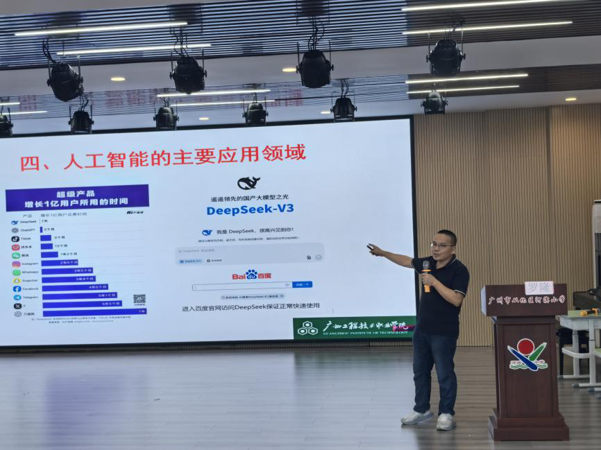 另一边,38场人工智能主题讲座,正掀起一场AI启蒙浪潮。黄翰教授从“知识表示”讲起,拆解人工智能如何理解世界,让玄妙的AI变得可感可知;黎培兴副教授揭示AI大模型背后的数学逻辑,展现基础科学如何支撑起最前沿的应用;程建兴教授揭开导弹中的智能奥秘,激励青少年科技报国;李震教授展示了人工智能在智慧农业领域的应用成果;陈孔阳副教授引导学生深入思考人工智能社会伦理议题;苏成悦教授为同学们介绍了AI及智能机器人技术进展;钟令枢副教授、方植彬主任带领同学们探秘低空经济,展示了“未来低空交通”的奇妙世界;闫红洋副教授让现场同学惊叹于AI视觉技术的神奇魅力;钟竞辉教授、黄晓红教授、刘国栋高级工程师、陈俊颖教授、罗隆副教授、王同聚正高级教师、章江花书记等也从人工智能的发展历程、应用场景、未来趋势等方面为同学们带来了人工智能的多维视角与鲜活案例。