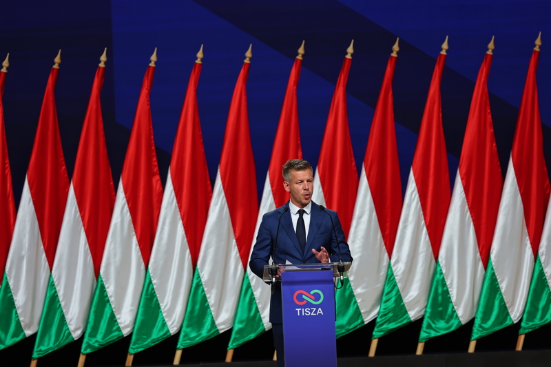 4月13日,在匈牙利布达佩斯,匈牙利蒂萨党领导人毛焦尔·彼得在国际新闻发布会上讲话。