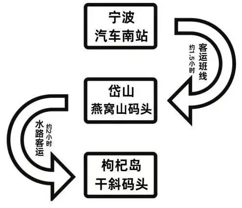 每日上午7:05,宁波南站发车,经岱山燕窝山码头换乘9:10轮渡前往枸杞岛干斜码头。