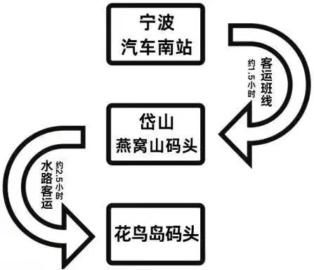 每日上午7:05,宁波南站发车,经岱山燕窝山码头换乘9:10轮渡前往花鸟岛码头。