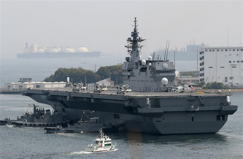 日本海上自卫队“出云”号直升机驱逐舰从位于日本神奈川县的横须贺美军基地出港。